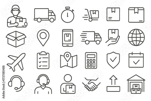 Delivery and logistics icon set. Collection of line icons for shipping, transport, e-commerce, and courier services. Vector symbols for order tracking, customer support, and warehouse.