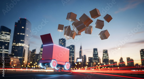 Delivery Cart with Boxes Flying in Urban Night Scene
