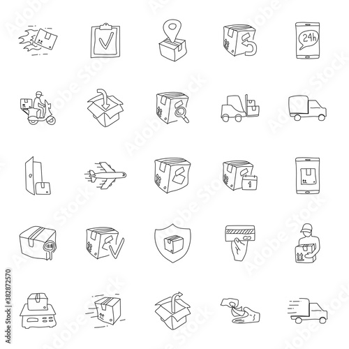 delivery hand drawn linear doodles isolated on white background. delivery icon set for web and ui design, mobile apps and print products