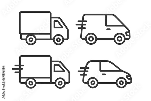 Delivery truck and van line icon set. Fast shipping and logistics vehicle symbols. Express courier service transport icons for web and apps. Editable stroke vector collection.