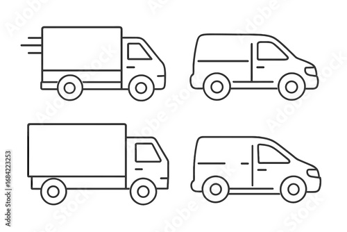 Delivery truck and van vector icon set. Simple linear outline collection for logistics, shipping, and transport services. Commercial vehicle, car, and lorry symbols.