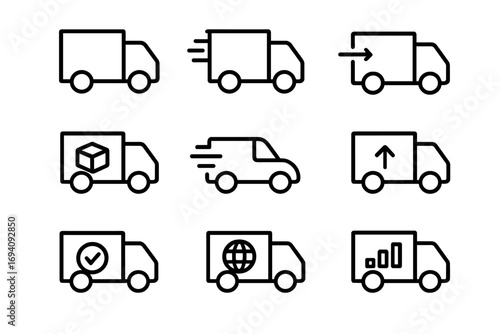 Delivery truck line icon collection. Logistics and shipping symbols for fast delivery, cargo transport, and freight service. Package tracking and worldwide shipping vector icons.