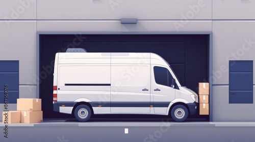 Delivery van loaded with packages, parked outside a logistics center, open back door, delivering online orders, detailed boxes, retail shipment scene