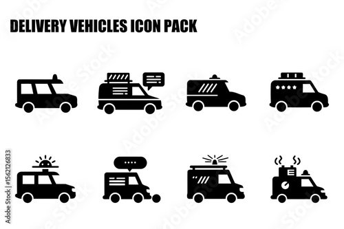 Delivery vehicles icon pack with various types, side profile, flat style, diverse uses. Different delivery vehicles with varied equipment and features.