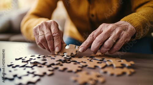 Dementia symptoms in a senior struggling to complete a puzzle in a living room. Featuring cognitive difficulties and confusion
