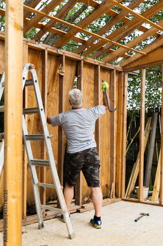 Demolition phase with a man tearing down an old shed with a crowbar in a backyard that was rotting and falling apart