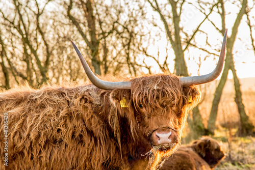 Den Helder, the Netherlands. January 2022. A grazing herd of highlanders at sunset in Mariendal, Den Helder.