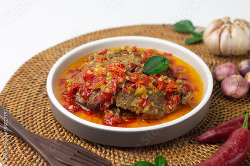 Dendeng Balado, Indonesian traditional beef cuisine from Padang, West Sumatra with slices beef cooked with some spices and a lot of chilies. served on ceramic plate and isolated white background.