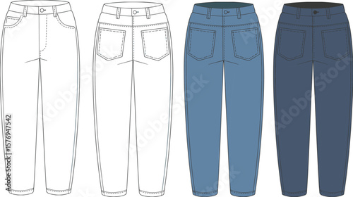 Denim jeans flat sketch, front and back view, fashion design template, technical drawing, blue jeans illustration, pants apparel mockup