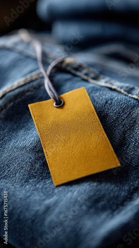 Denim jeans with yellow tag hanging from string