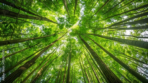 dense ancient forest with towering trees and lush greenery, showcasing a thick canopy with sunlight filtering through the foliage, creating a timeless and enchanting woodland scene