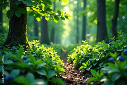 Dense blueberry bushes thrive in a shaded forest clearing, foliage, greenery, woodland