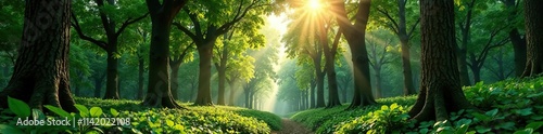 Dense canopy of Diospyros decandra trees in forest clearing, nature, sunlight, tropical