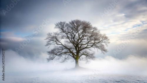 Dense fog envelops a lone bare tree standing tall amidst swirling white mist