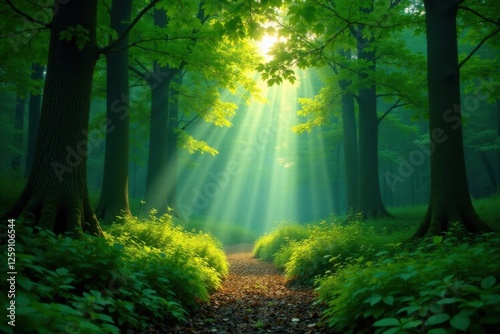 Dense foliage and towering trees create a sense of depth and dimensionality, as dappled sunlight illuminates the forest floor, sunlit forest, wooded landscape, forest lighting