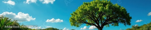 Dense foliage of gajumaru tree against vibrant blue sky, leaves, nature