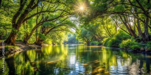 Dense foliage surrounds tranquil waterway, where sunlight filters through leafy canopy, casting dappled shadows on riverbed