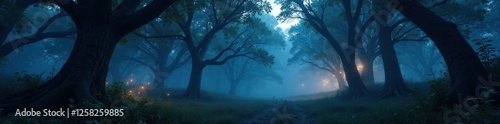 Dense forest at dusk with misty atmosphere, twisted trees, and glowing fireflies, mystical, forest
