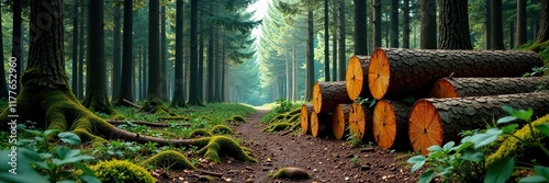 Dense forest with large logs stacked horizontally, natural, forest