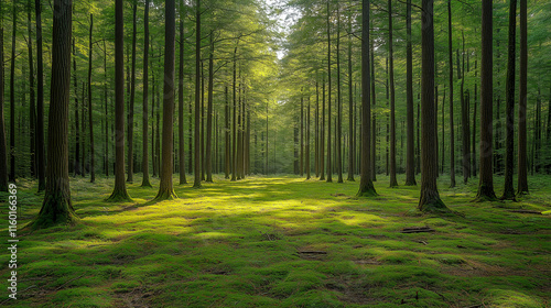 dense forest with tall pine trees, dappled sunlight filtering through the canopy, serene atmosphere