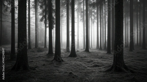 Dense forest with tall trees shrouded in atmospheric fog and mist