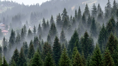 Dense Green Pine Forest in Misty Mountain Landscape with Conifer Trees