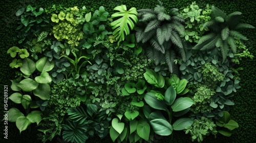 Dense lush green tropical foliage with variety of leaves and plants creating a vibrant natural backdrop