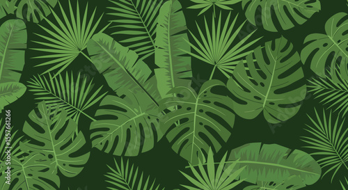 Dense tropical foliage pattern featuring monstera banana and palm leaves.
