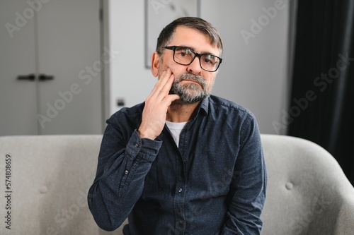 Dental Care, Tooth Sensitivity Concept. Portrait of unhappy mature man suffering from terrible toothache, touching cheek feeling acute pain, aged male sitting on the couch at home, free copy space