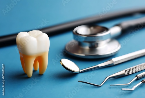 Dental Health Care Tools and Model Tooth on Blue Background for Dentistry