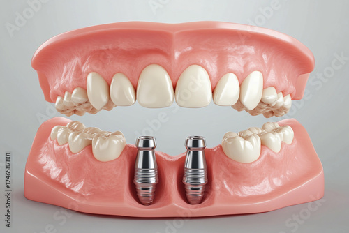 Dental implants displayed in a model of a human jaw demonstrating oral health and restoration procedures