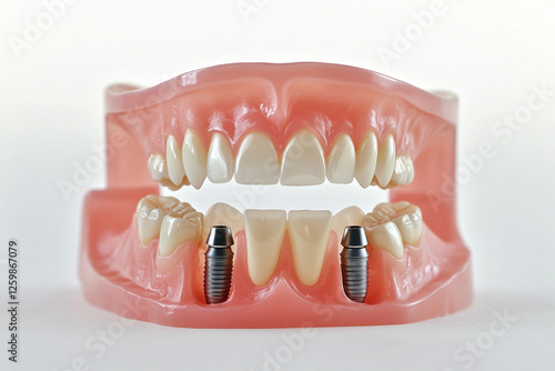 Dental implants displayed in a model of a human jaw demonstrating oral health and restoration procedures