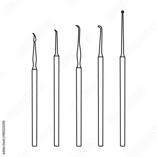 Dental instruments for the treatment of alveolar pyorrhea, excavator, hook, curette, enamel knife, dentist tool silhouette sketch