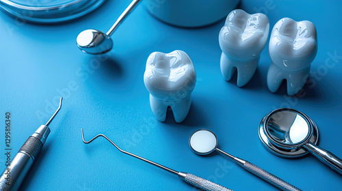 Dental tools arranged with ceramic teeth models on a blue surface in a dental office setting. Generative AI