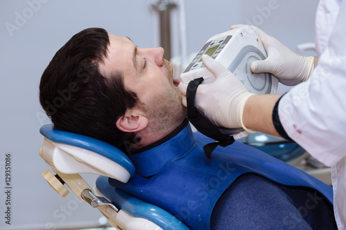 Dentist doctor hand holding medical tools in dental office near patient face. Concept of healthy