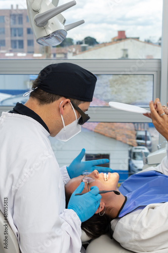 Dentist man about to start a dental intervention to a woman. Dental clinic concept
