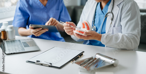 Dentist sitting at table with jaw samples tooth model and working with tablet and laptop in dental office professional dental clinic. medical doctor working.