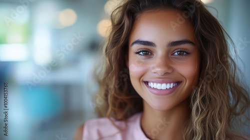 dentist smiling while holding a dental mirror assisting a woman in a pink top sitting comfortably in a modern dental office