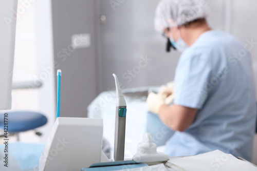 Dentist with binocular glasses at work. Vertical photo on a light background. Preparation for the installation of a dental implant. Aesthetic dentistry. The doctor is out of focus.