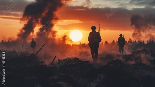 Depict a battlefield at dawn, with smoke rising from the ground, soldiers silhouetted against the fiery horizon, and the remnants of past conflict scattered across the terrain."