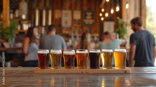 Depict the final step of a brewery tour, where visitors are seen enjoying their chosen beers in a relaxed setting. The image should include a mix of people savoring different types of beer, with the
