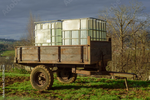 Depósitos de plástico llenos de agua sobre carro de madera en campo