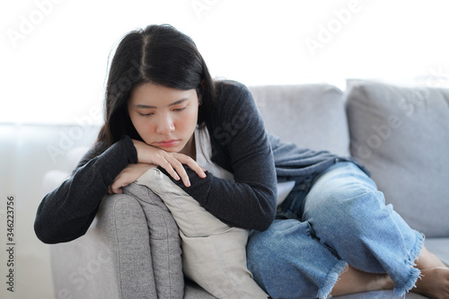 Depressed lonely unhappy mental woman sitting alone on the sofa at home with hand on face feel stress sad and worried disappointment while facing problem during coronavirus or covid-19 pandemic