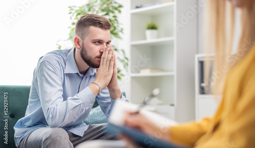 Depressed man talking about problem, psychologist session in bright office, mental healthcare concept