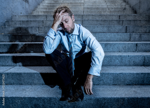 Depressed sad business man in total despair felling hopeless and frustrated sitting in city stairs