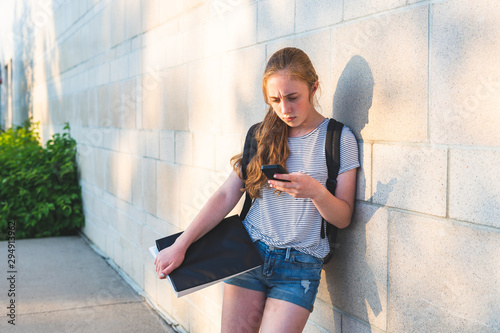 Depressed/Sad teen girl leaning against high school wall during sunset while wearing a backpack and holding binders/smartphone.