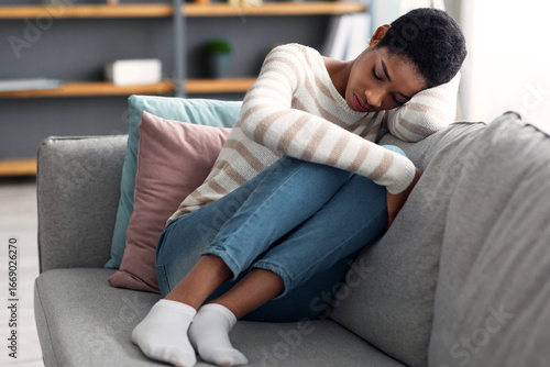 Depression Concept. Portrait Of Sad African American Female Sitting On Sofa At Home, Upset Black Lady Suffering Melancholy, Having Bad Mood Or Nervous Breakdown, Feeling Bad And Lonely, Closeup