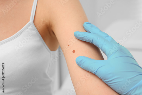 Dermatologist in rubber glove examining patient's birthmark on blurred background, closeup