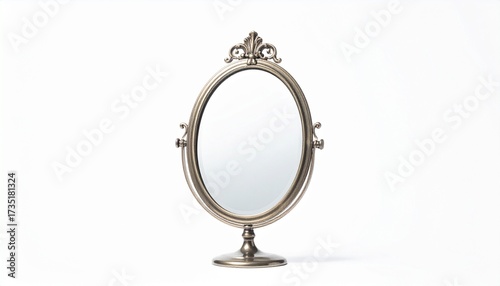 Describe a round mirror with metallic frame and side knobs reflecting sky and clouds. Highlight its serene mood, symmetrical composition, and blend of natural and man-made elements.