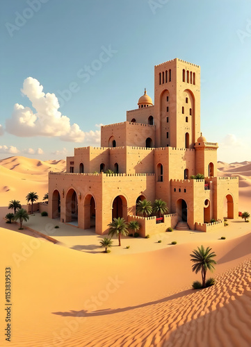 Desert architecture with traditional Arabic oriental motifs. Abstract buildings in the desert. City in the desert, sands. AI new image
